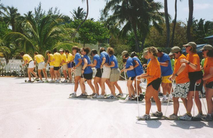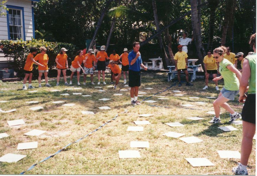 We provide 20 minute cooperative problem solving activities that can be selected to create a series of activities in which teams participate. For example, teams can rotate through five 20 minute activities in a two-hour program. Humorous group stretches such as hourglass, windmill, corporate pushups, and quick line-up are excellent icebreakers and warm-ups to get the cooperative juices flowing. The 20-minute team building activities are listed below.