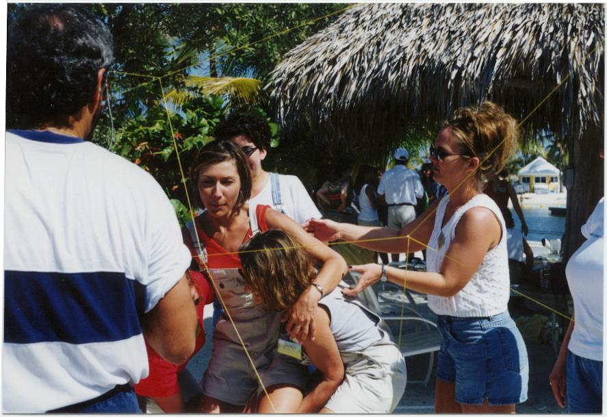 Participants pass fellow team members through a “web,” in which each hole of the web an be used only once.